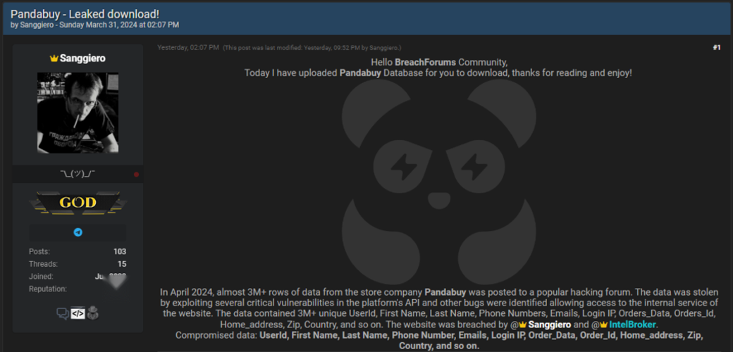 The breach, which occurred in late March 2024, was publicly announced on a well-known hacking forum by individuals identifying themselves as 'sanggiero' and 'intelbroker', who claimed responsibility for the unauthorized access to Pandabuy's database.