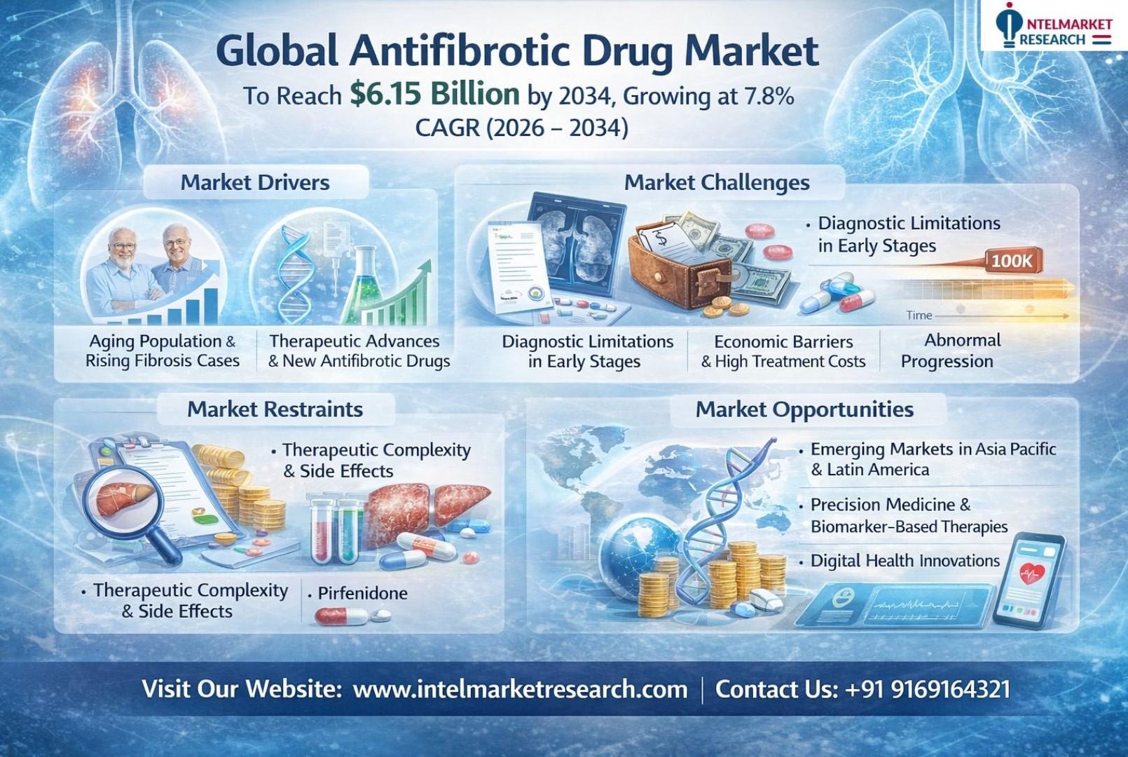 According to a new report from Intel Market Research, the global Antifibrotic Drug market was valued at USD 3.42 billion in 2025 and is projected to reach USD 6.15 billion by 2034, growing at a CAGR of 7.8% during the forecast period (2026–2034). This expansion stems from increasing fibrotic disease prevalence, therapeutic advancements, and expanding applications across multiple organ systems.