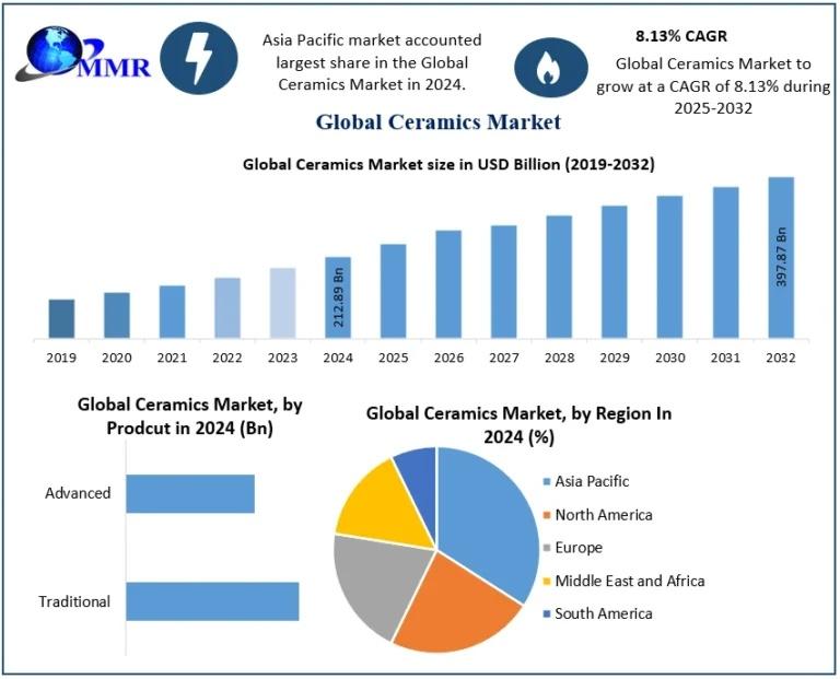 Anticipated Growth in Revenue: The Ceramics Market size was valued at USD 212.89 Billion in 2024 and the total Ceramics revenue is expected to grow at a CAGR of 8.13% from 2025 to 2032, reaching nearly USD 397.87 Billion.