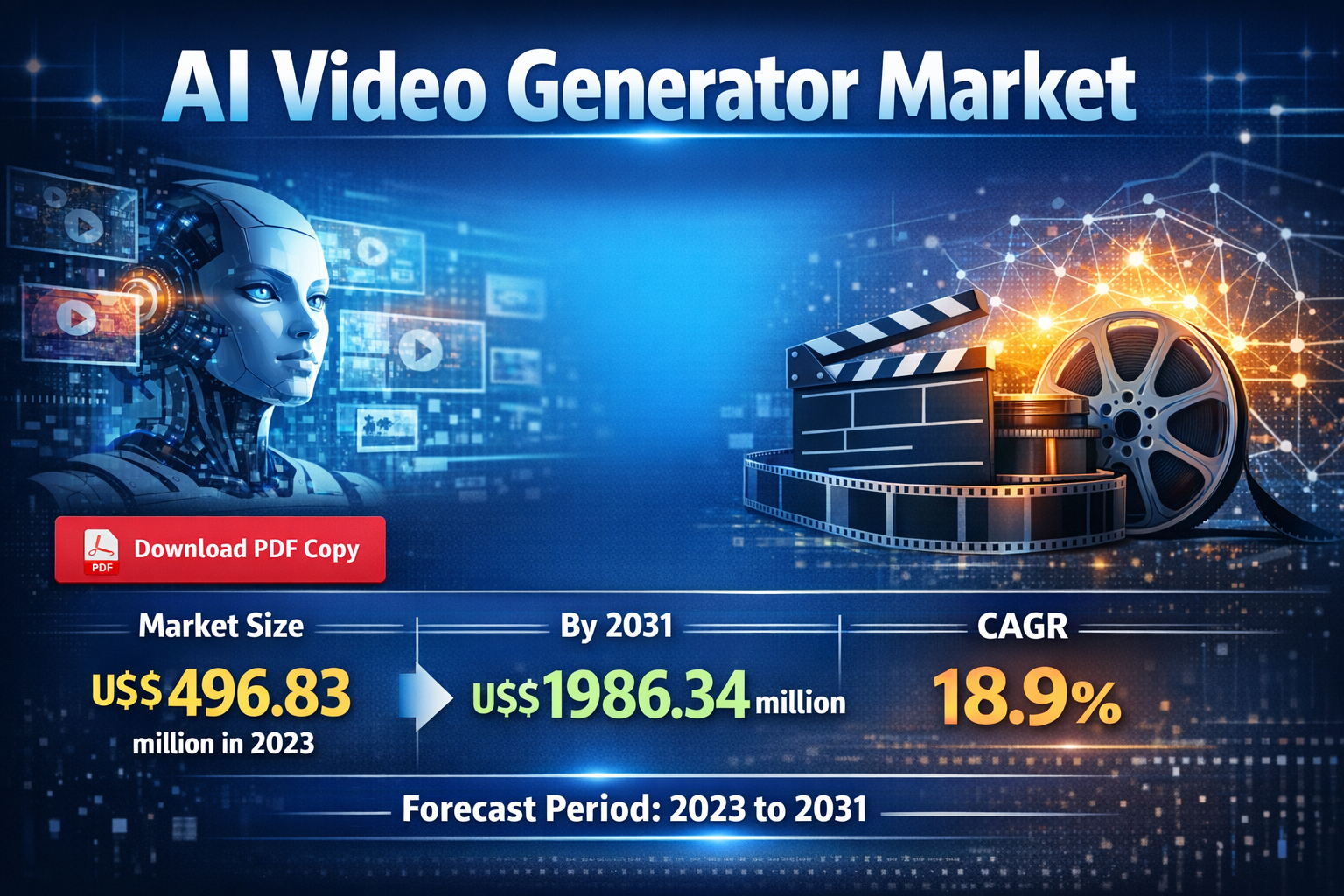 The global AI video generator market is experiencing significant growth, driven by the increasing demand for video content across various sectors. The AI video generator market size is projected to reach US$ 1986.34 million by 2031 from US$ 496.83 million in 2023. The market is expected to register a CAGR of 18.9% in 2023–2031. understanding the segmentation of this market is crucial for stakeholders looking to capitalize on emerging opportunities. This analysis focuses on the key segments of the AI video generator market, including type, application, deployment mode, and geography, while highlighting the leading players in the industry.