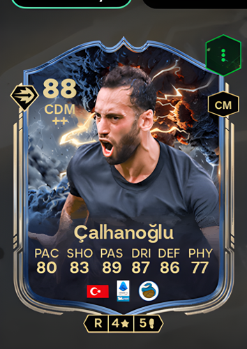 Hakan Çalhanoğlu's Thunderstruck card features the Inter Milan maestro as a formidable Central Defensive Midfielder, boasting an impressive overall rating of 88. This special item highlights his well-rounded attributes, including a sharp 89 passing, 87 dribbling, and a solid 86 in defense. As a deep-lying playmaker, this card excels in orchestrating the game from the back, where his exceptional vision and pinpoint distribution can dismantle defensive lines and launch decisive attacks, allowing your team to control the midfield and create game-winning opportunities.