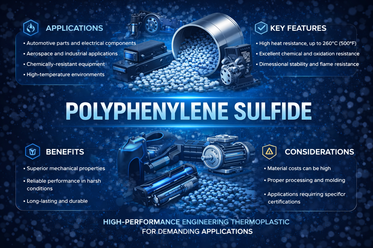 Polyphenylene Sulfide (PPS) is a high performance engineering thermoplastic known for its exceptional thermal stability, chemical resistance, and mechanical strength. It is widely used across automotive, electrical and electronics, aerospace, and industrial applications where durability and long term performance under extreme operating conditions are essential.