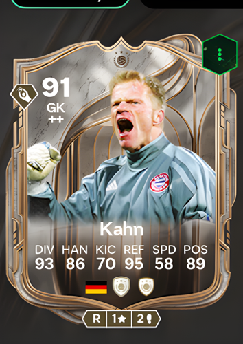 Oliver Kahn's Icon card stands out as a top-tier Goalkeeper option in the game, boasting an impressive overall rating of 91. With exceptional attributes in diving, reflexes, handling, and positioning, this card truly captures the commanding presence Kahn was known for on the pitch. As a goalkeeper, his strengths translate into reliable shot-stopping ability, quick reactions to dangerous situations, and an unyielding control of the penalty area, making him a formidable last line of defense who can single-handedly keep your team in the game during crucial moments.