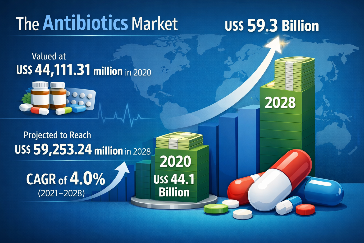 The Antibiotics Market Dynamics in North America are shaped by multiple growth drivers, restraints, and emerging opportunities. One of the primary growth factors is the rising incidence of bacterial infections and chronic diseases requiring antibiotic intervention. The antibiotics market was valued at US$ 44,111.31 million in 2020 and is projected to reach US$ 59,253.24 million in 2028; it is expected to grow at a CAGR of 4.0% during 2021–2028. Additionally, the region benefits from a well-established pharmaceutical ecosystem and significant investments in research and development.