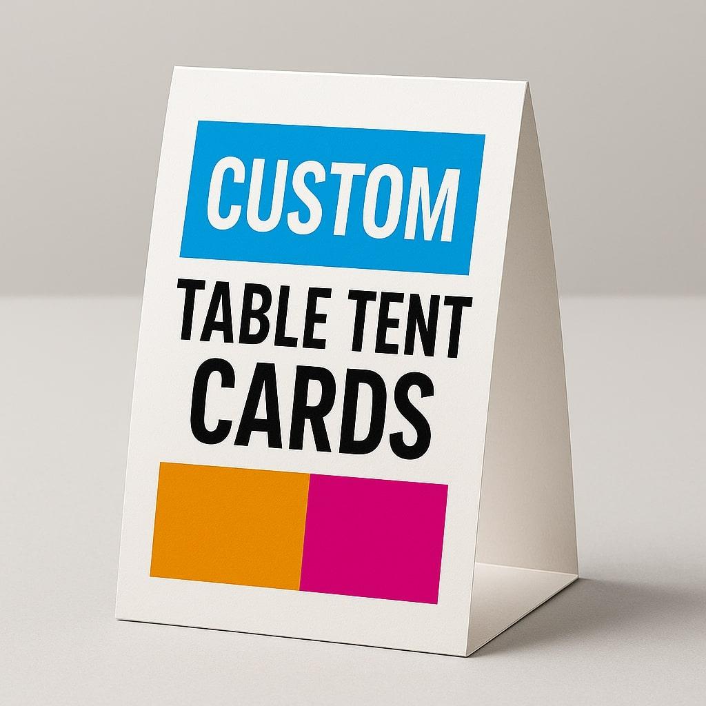 Custom table tent cards are folded, often triangular-shaped cards designed to sit upright on a table or counter. Unlike standard signage, they are fully customizable, allowing businesses to incorporate their logo, brand colors, messaging, and even QR codes for digital engagement.