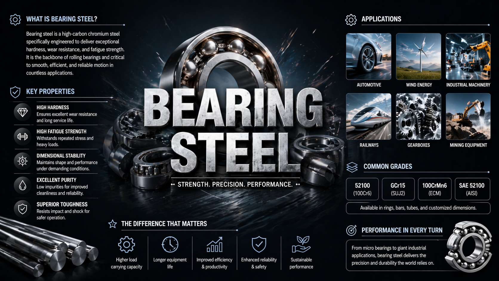 Bearing steel is a specialized material designed to provide high wear resistance, fatigue strength, and durability in rotating machinery components. It is widely used in the production of bearings for automotive systems, industrial machinery, aerospace equipment, and energy applications, ensuring smooth operation and long service life under high stress conditions.