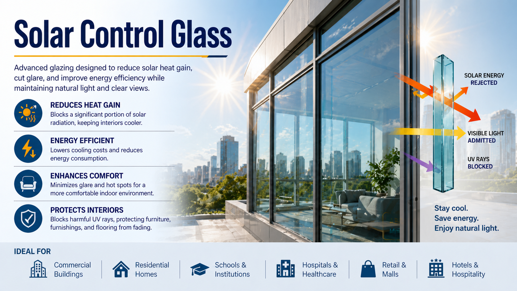Solar control glass refers to advanced glazing materials designed to reduce solar heat gain while maintaining natural light transmission. It is widely used across residential buildings, commercial infrastructure, and automotive applications to improve thermal comfort, reduce energy consumption, and enhance UV protection in modern construction systems.