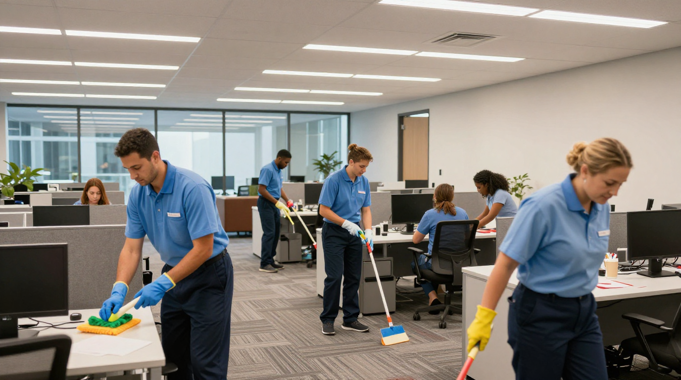 It typically involves surface cleaning, waste removal, restroom sanitation, and maintaining shared spaces for a healthier work environment.