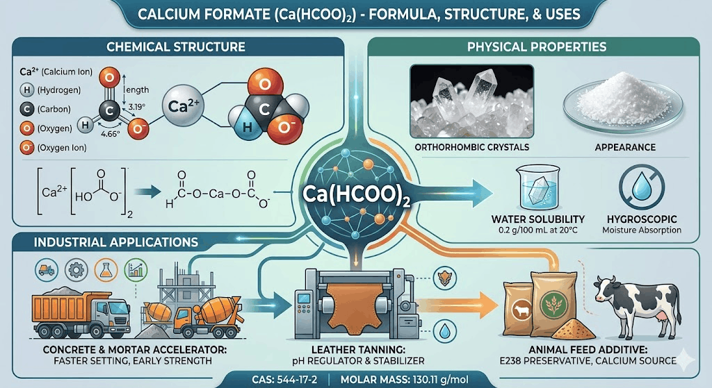 Industrial grade calcium formate is manufactured to specifications that prioritize purity, consistent particle size, and reliable solubility characteristics that determine its performance as a concrete admixture. The primary commercial application is as a Type C concrete accelerating admixture under ASTM C494 and equivalent standards, where it functions by accelerating the hydration reactions of calcium silicate phases in Portland cement, producing faster early strength gain without the corrosion risks associated with chloride-based accelerators such as calcium chloride.