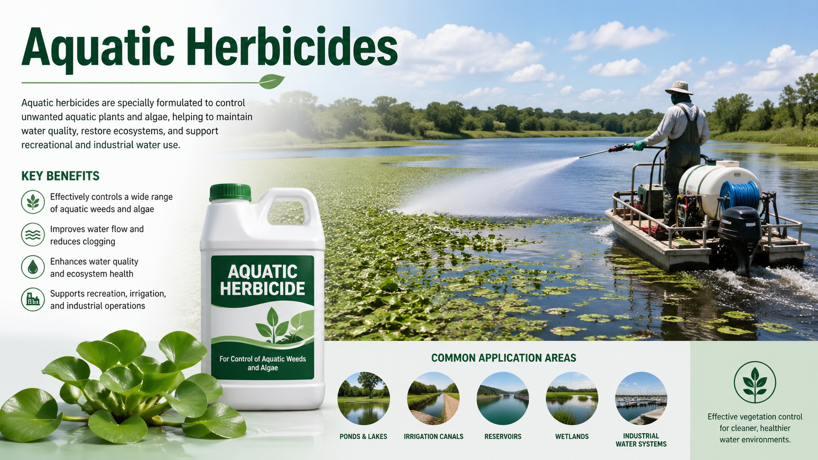 - Customized herbicide solutions for lakes, rivers, reservoirs, irrigation channels, and industrial water systems