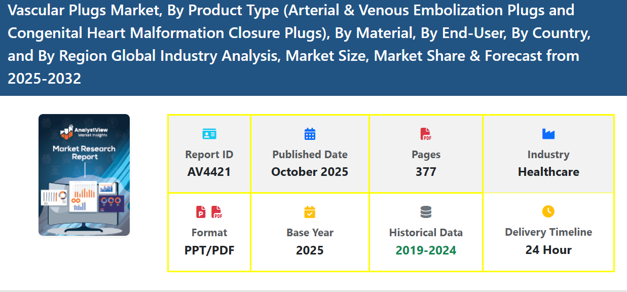 The Vascular Plugs Market is experiencing steady growth driven by advancements in minimally invasive cardiovascular procedures and the rising prevalence of vascular diseases. Vascular plugs are specialized medical devices used to occlude or block abnormal blood flow in blood vessels. They are widely applied in procedures such as embolization, treating congenital heart defects, managing aneurysms, and controlling blood loss during complex surgeries. Compared to traditional surgical methods, vascular plugs provide greater precision, reduced procedural time, and faster patient recovery—critical advantages that continue to boost their adoption in modern healthcare.
