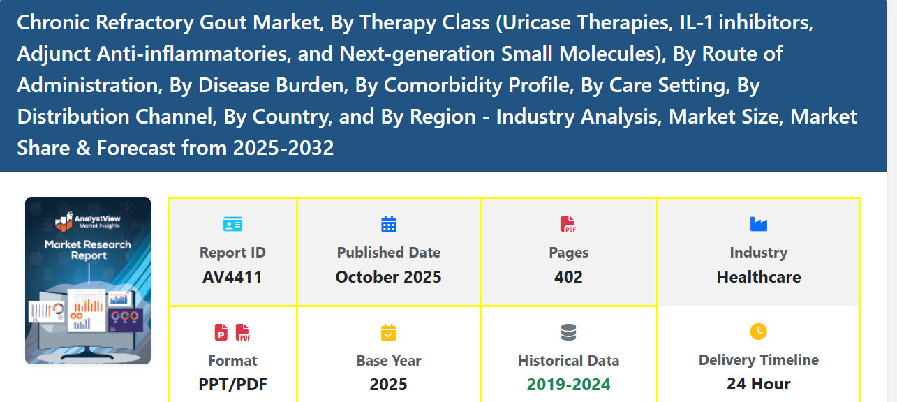 The Chronic Refractory Gout Market is witnessing steady growth as the prevalence of gout and related comorbidities continues to rise worldwide. Chronic refractory gout is a severe form of gout that does not respond adequately to conventional urate-lowering therapies, resulting in persistent uric acid crystal deposition, joint inflammation, and tophi formation. Patients often face debilitating pain, decreased mobility, and long-term joint damage, creating an urgent need for effective therapeutic interventions.
