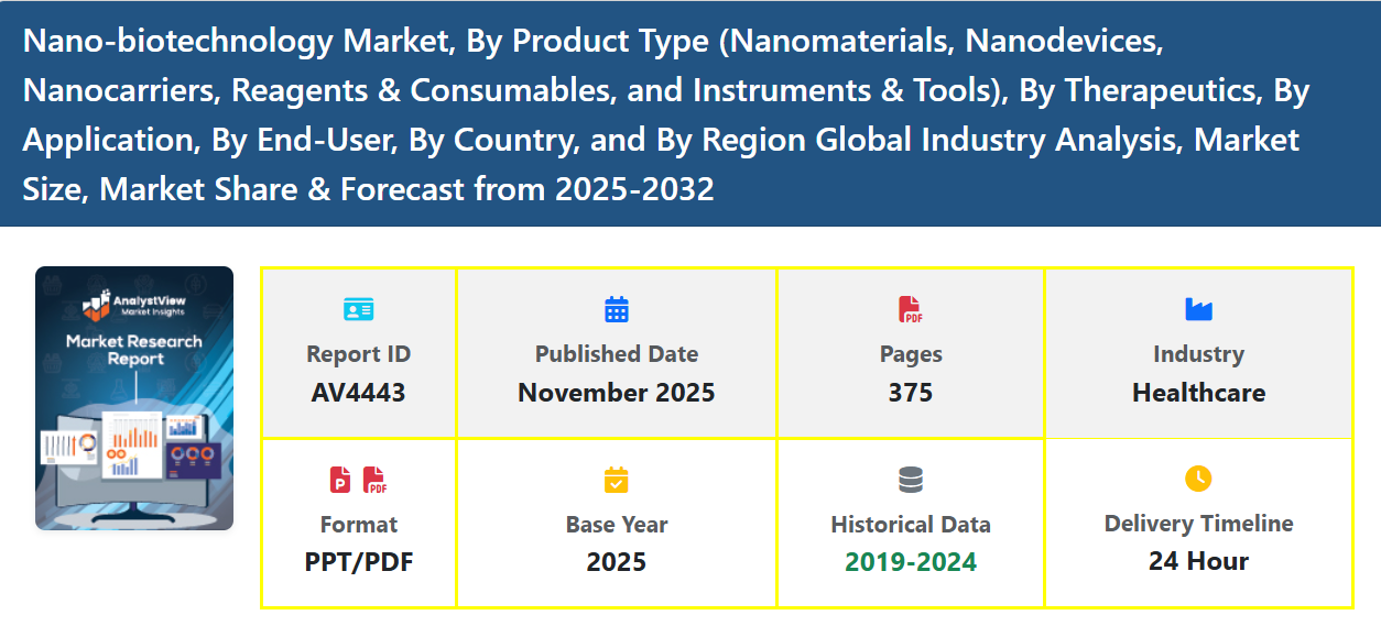 The Nano-biotechnology Market is witnessing rapid expansion as nanotechnology and biological sciences converge to create breakthroughs in healthcare, pharmaceuticals, agriculture, environmental monitoring, and industrial processes. Nano-biotechnology involves the use of nanoscale materials, tools, and engineering techniques to manipulate biological systems, enabling advanced diagnostics, targeted drug delivery, regenerative medicine, and precision therapies. With growing demand for highly sensitive diagnostics, personalized medicine, and efficient therapeutic systems, nano-biotechnology has become one of the most transformative fields in modern science and industry.
