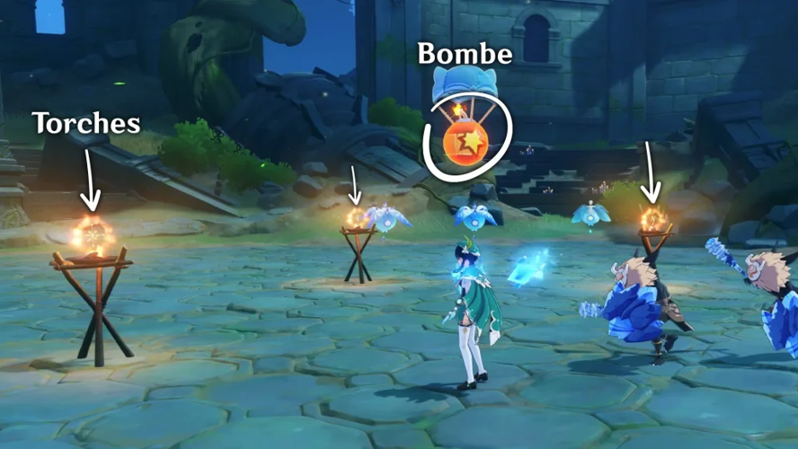 Lorsque la bataille débute, plusieurs stratégies s’offrent à vous pour venir à bout des monstres. Tout d’abord, l’utilisation des trois torches est essentielle : elles dispersent l’élément pyro, facilitant la concentration des ennemis. Pour maximiser leur efficacité, invoquez votre déchaînement à proximité des torches afin d’attirer tous les adversaires vers ce point précis.