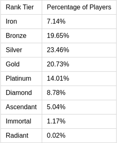 Selon les données récentes de tracker.gg, combinées avec les analyses de vstats.gg et esports tales, la répartition pour 2025 se présente comme suit :Une analyse approfondie révèle une forte concentration de joueurs dans les rangs d'argent, de bronze et d'or, qui constituent le cœur de la population compétitive. En revanche, les niveaux supérieurs, tels qu'Immortel et Radiant, sont dominés par une élite restreinte et privilégiée.
