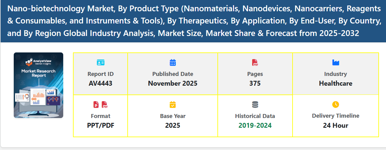 The Nano-biotechnology Market is witnessing rapid expansion as nanotechnology and biological sciences converge to create breakthroughs in healthcare, pharmaceuticals, agriculture, environmental monitoring, and industrial processes. Nano-biotechnology involves the use of nanoscale materials, tools, and engineering techniques to manipulate biological systems, enabling advanced diagnostics, targeted drug delivery, regenerative medicine, and precision therapies. With growing demand for highly sensitive diagnostics, personalized medicine, and efficient therapeutic systems, nano-biotechnology has become one of the most transformative fields in modern science and industry.