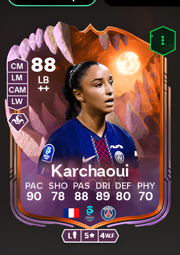 Sakina Karchaoui's Ultimate Scream card stands out as an exceptional Left Back, boasting an impressive overall rating of 88. With a blistering pace of 90, sharp dribbling at 89, and an outstanding passing score of 88, Karchaoui brings a dynamic edge to both defensive and attacking plays. Her solid defense rating of 80 ensures reliability at the back, while a shooting rating of 78 adds an extra threat going forward. Although her physicality sits at 70, the combination of speed, technical ability, and defensive prowess makes this card a game-changer for any squad. As a Left Back, Karchaoui's attributes allow her to quickly transition from defense to attack, break down opposition lines, and create scoring opportunities, making her an invaluable asset for sealing victory in crucial moments.