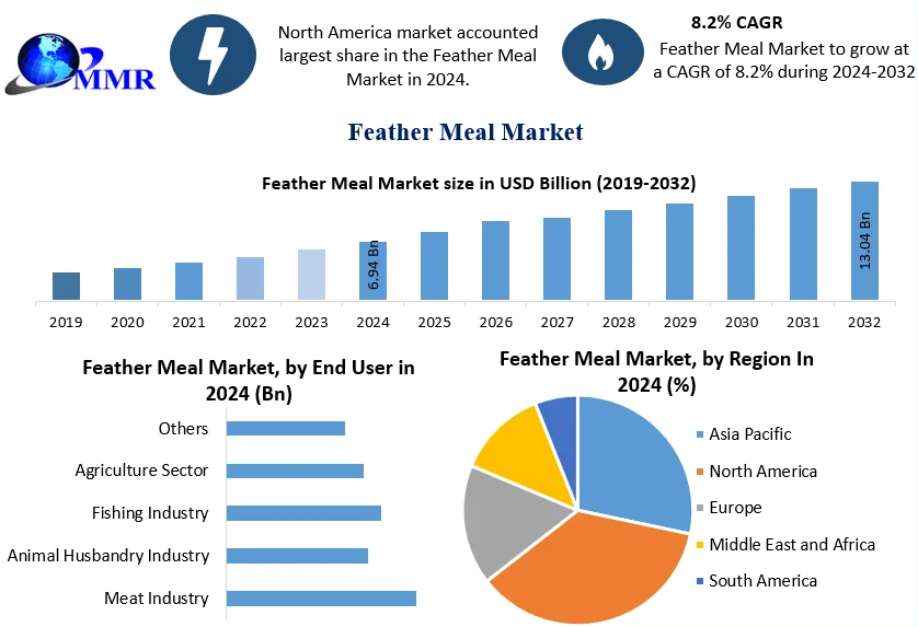 The Global Feather Meal Market has established itself as a critical segment within the broader agricultural and animal feed industries due to its unique position as an eco‑friendly, high‑protein product derived from poultry industry by-products. The global feather meal market was valued at approximately USD 6.94 billion in 2024 and is projected to reach around USD 13.04 billion by 2032, exhibiting a CAGR of 8.2% over the forecast period of 2025‑2032.