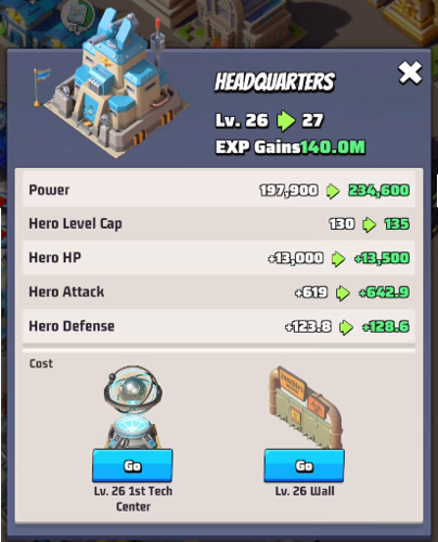Upgrading your headquarters also increases your overall power, hero level cap, and enhances hero attributes including health points (HP), attack, and defense. Additionally, each building's level cap is raised, enabling further enhancements.