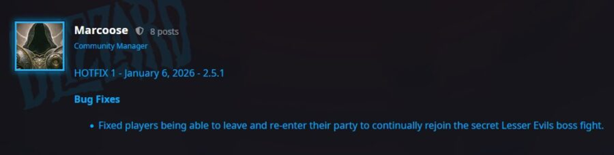 Players can now no longer exploit the secret Lesser Evils boss encounter by repeatedly leaving and rejoining their party, ensuring fairer gameplay.