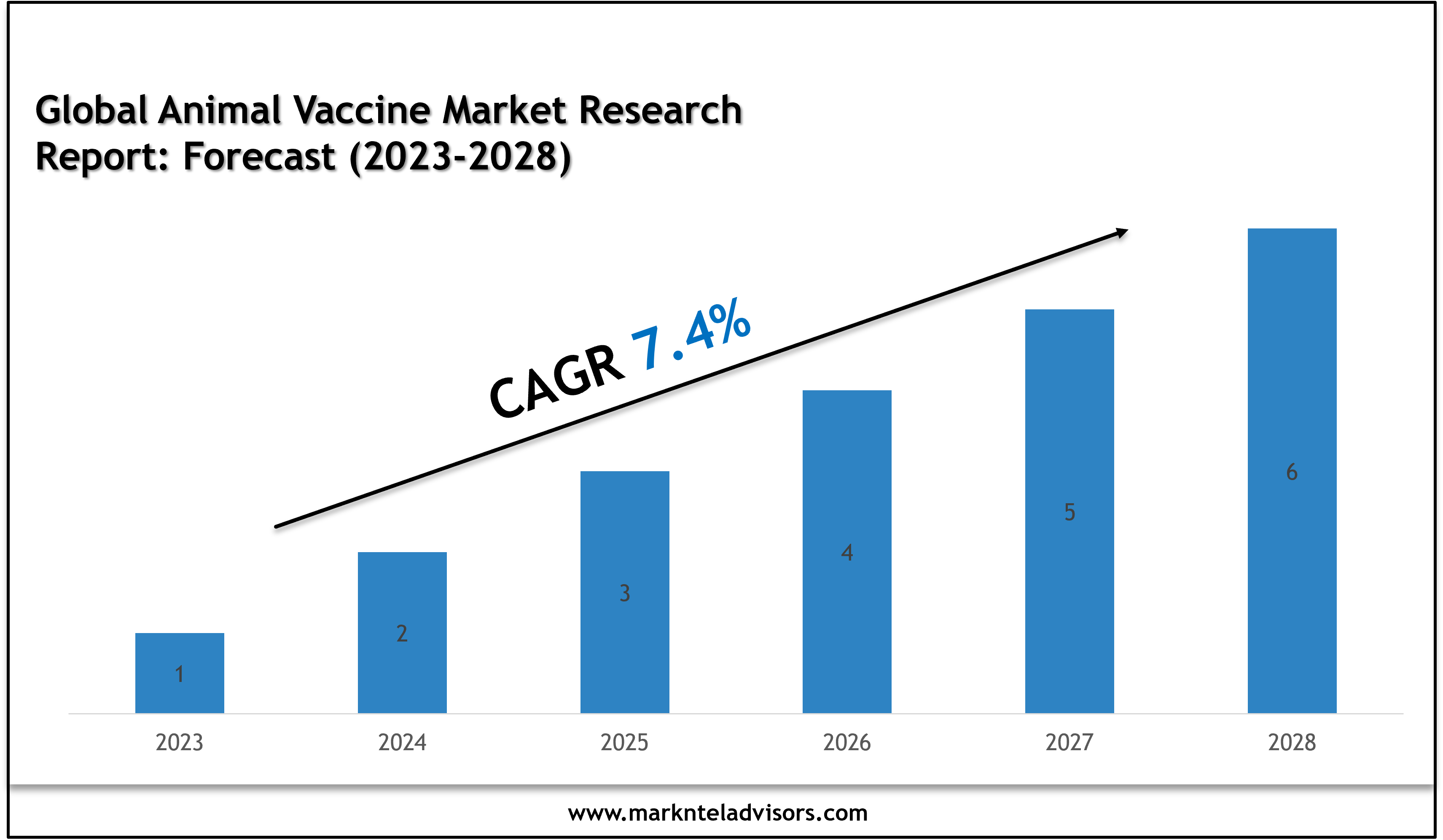 The Global Animal Vaccines Market is projected to grow at a CAGR of around 7.4% during the forecast period, i.e., 2023-28. The constantly inflating livestock population paving the way for bursts of cattle disease has been the prime factor behind the wide acceptance of vaccines throughout the globe. Besides, the rising trend of pet ownership also increases awareness of domestic animals' health, propelling the market growth.