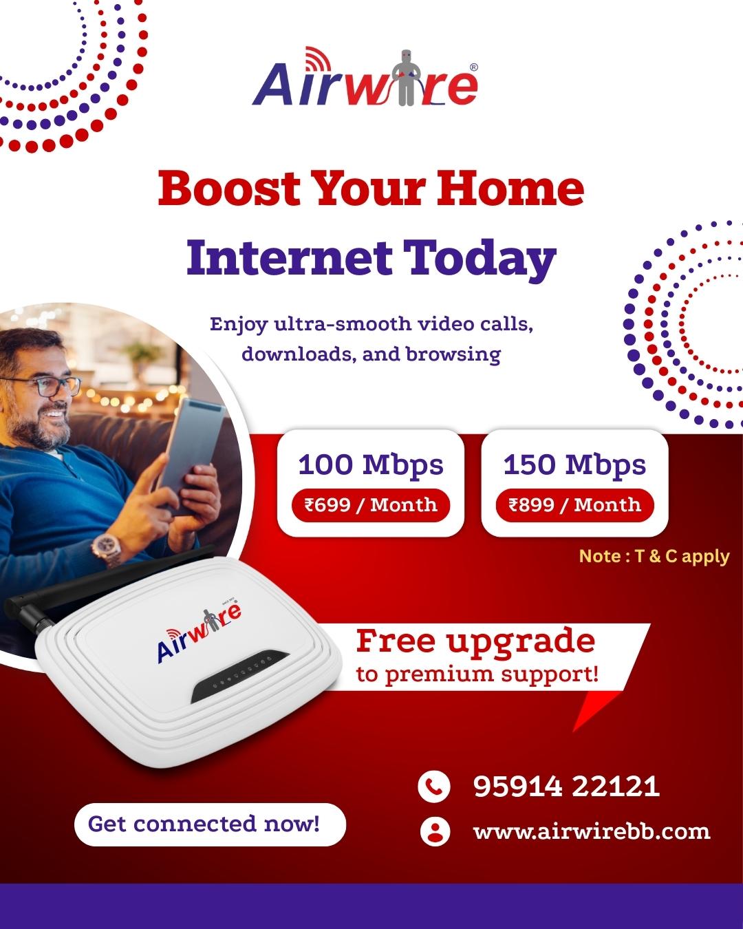 Depending on the plan, Airwire includes extras such as free OTT-platform access, voice/VoIP services, possibly UPS/backup for WiFi, and sometimes other perks for longer-term subscriptions.