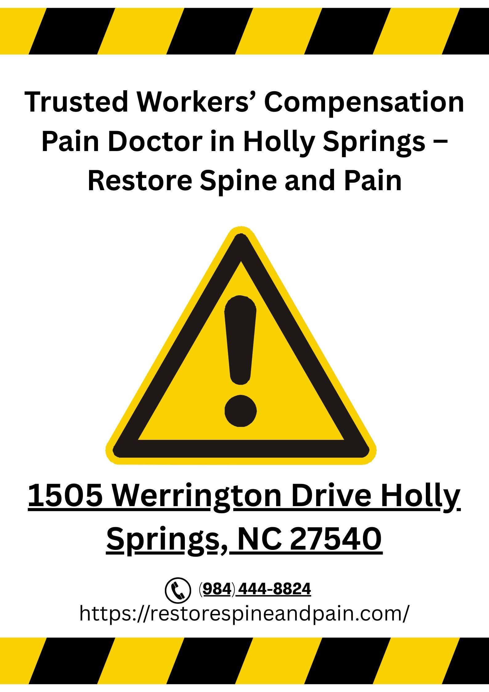 Restore Spine and Pain offers expert workers’ compensation care in Holly Springs, providing personalized treatment plans for injury recovery, pain relief, and long-term healing to help you safely return to work and daily life.
