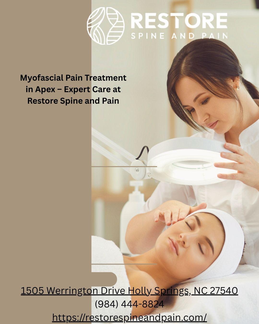 If you are struggling with chronic muscle pain, stiffness, or trigger points, Myofascial Pain Treatment in Apex at Restore Spine and Pain can help you find lasting relief. Myofascial pain syndrome often develops when tight muscle bands and trigger points cause discomfort that can spread to other areas of the body. At Restore Spine and Pain, experienced specialists focus on identifying the root cause of your pain and creating a personalized treatment plan to improve mobility and reduce discomfort.